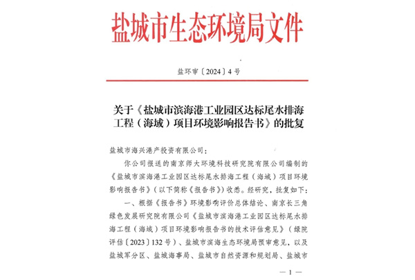 鹽城市濱海港工業(yè)園區(qū)達(dá)標(biāo)尾水排海工程(海域)項(xiàng)目取得環(huán)評批復(fù)